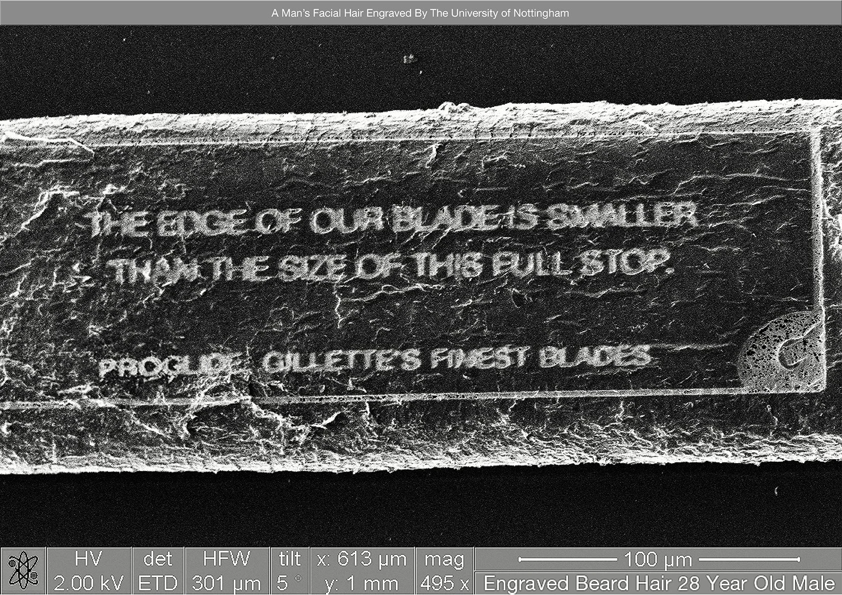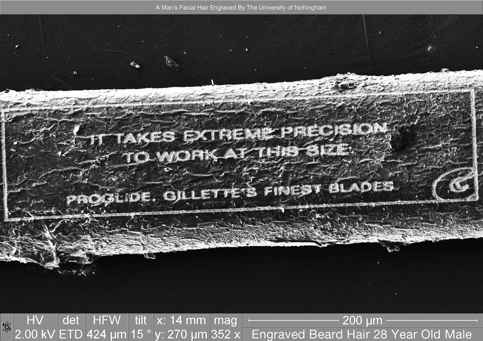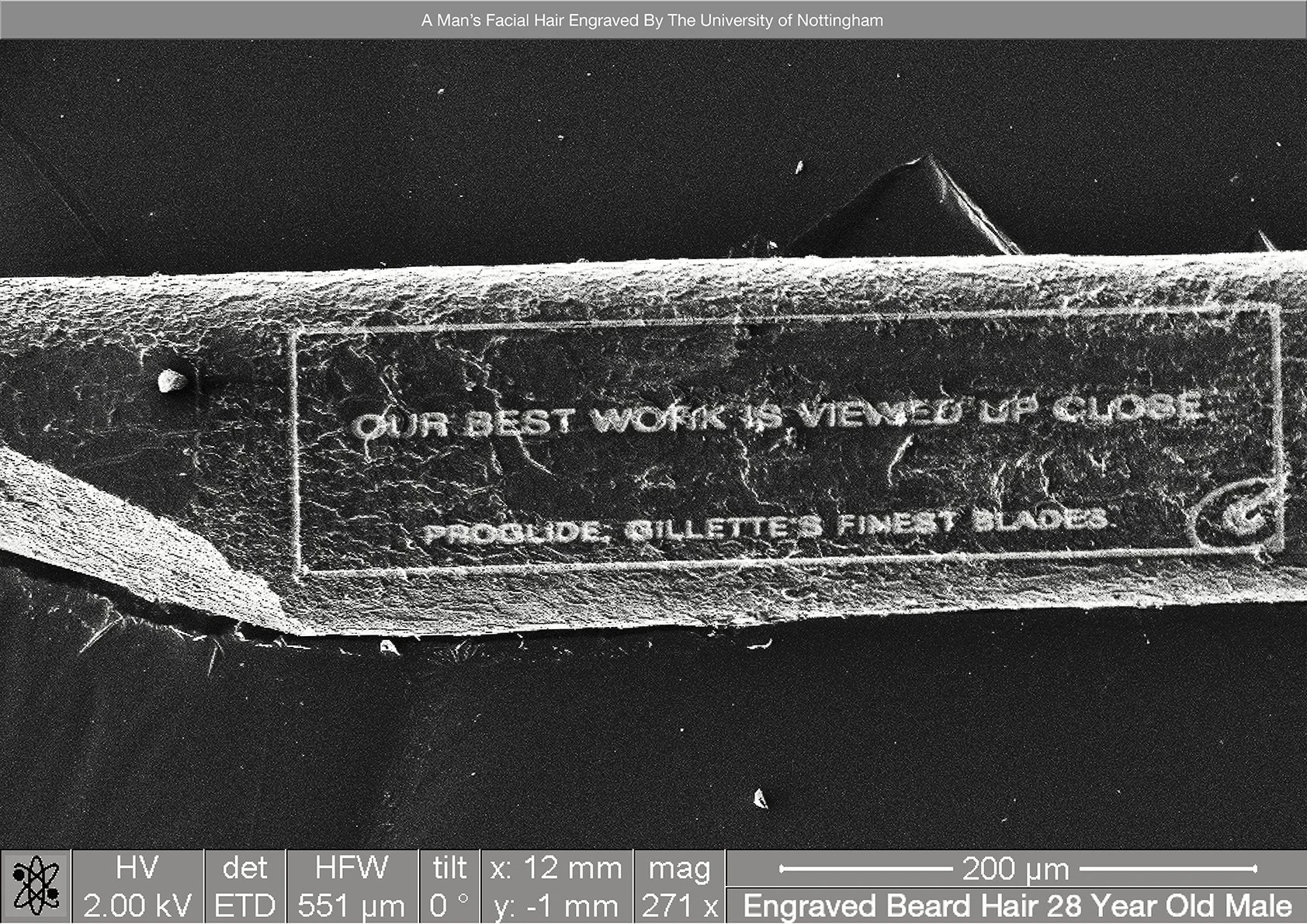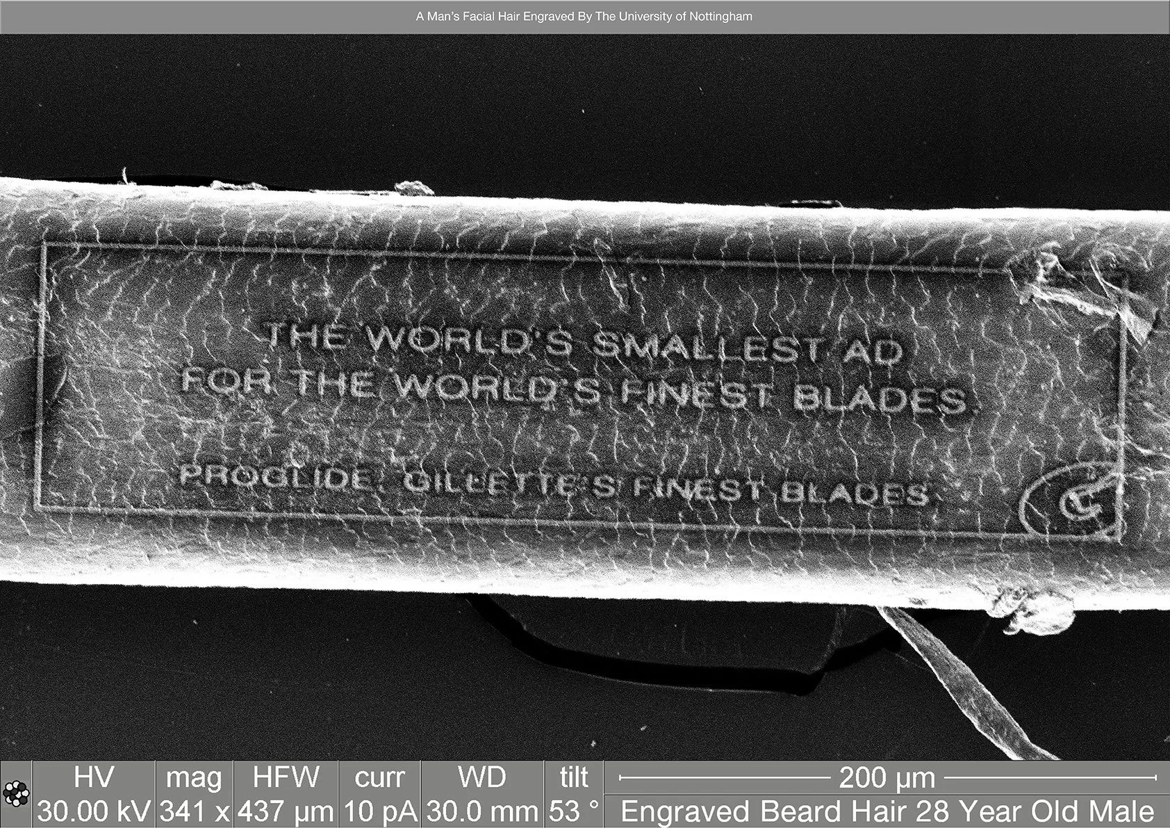 Gillette is renowned for having precisely thin blades, the world’s thinnest in fact, that result in the closest shave. To prove this we used nanotechnology to write an ad campaign on a single piece of stubble from a fresh shave.