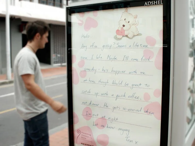 At first glance, the posters appear to be a happy letter to a friend, but if you look closely, you will realise that the lines of the notepaper seamlessly continue the story and reveal the heartbreaking truth of the situation.